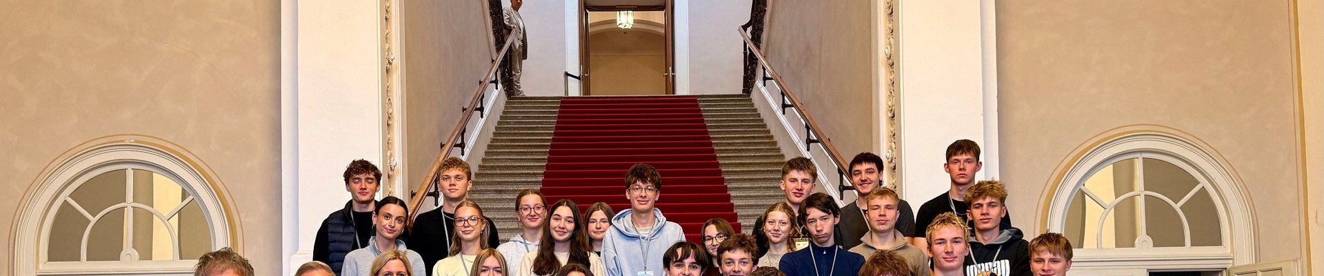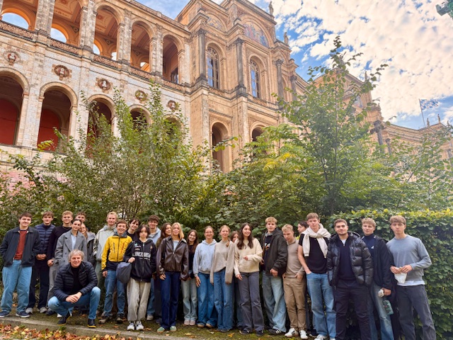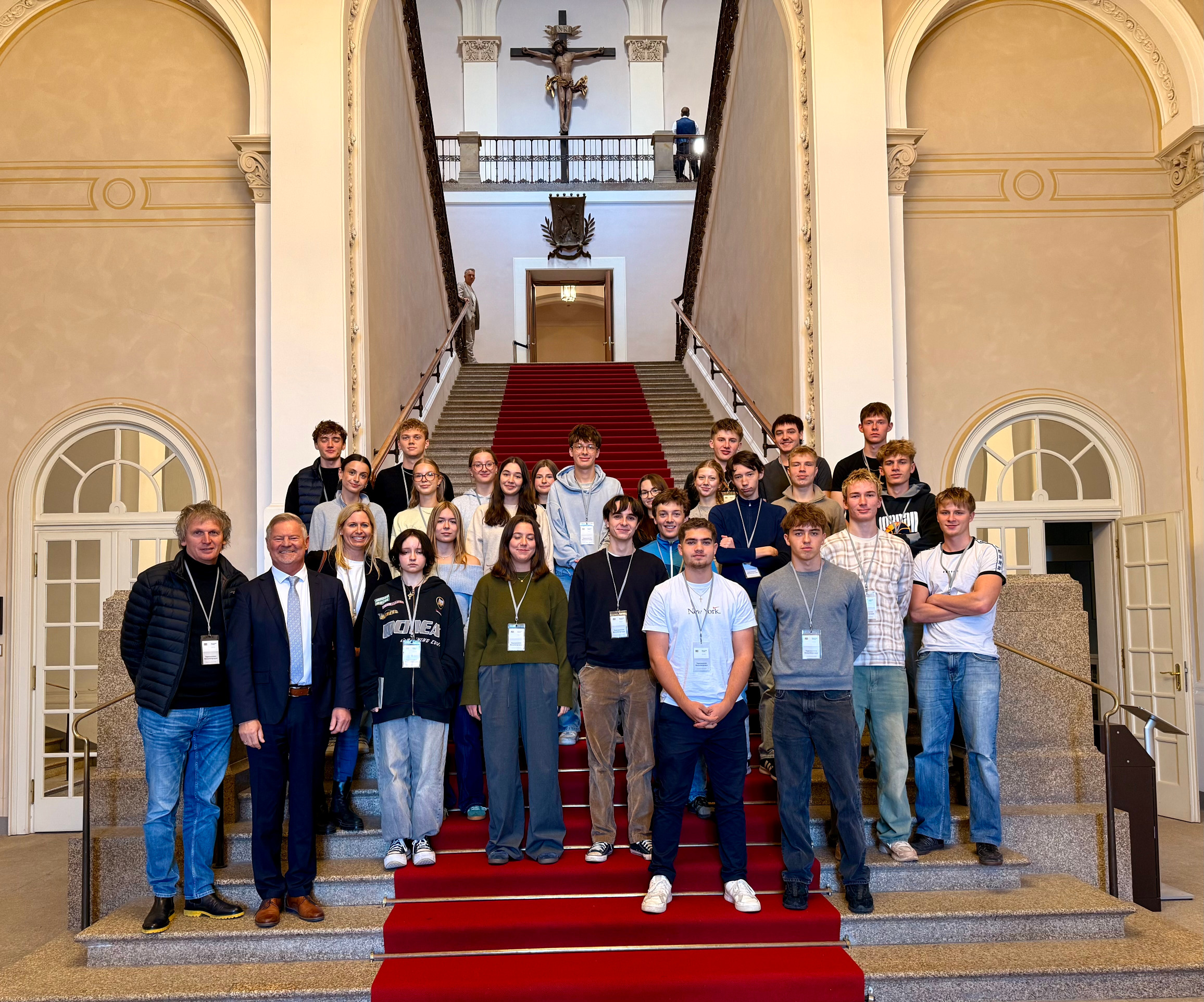 Der stellvertretende Ministerpräsident und Wirtschaftsminister Hubert Aiwanger eilt noch schnell zum Mittagessen in die Landtagskantine, Innenminister Joachim Hermann geht die große Treppe in Richtung Plenarsaal hinauf, in dem Gesundheitsministerin Judith Gerlach schon Platz genommen hat, ein Abgeordneter gibt der Presse in der Empfangshalle ein Interview und mittendrin sind die Schülerinnen und Schüler der Q12- und Q13-Kurse des Leistungsfaches Politik und Gesellschaft, die zur ersten Plenarsitzung nach der Sommerpause am 8. Oktober 2025 im Bayerischen Landtag zu Besuch sind. Auf der Besuchertribüne können die Kursteilnehmer die hitzige Debatte zum Gesetzentwurf der AFD-Fraktion zur Aufhebung des Bayerischen Beauftragtengesetzes verfolgen, bei der schnell klar wird, dass die restlichen im Landtag vertretenen Fraktionen CSU, SPD, Bündnis 90/ Die Grünen und Freie Wähler ein demokratisches Gegengewicht dazu bilden. Der Antrag wird abgelehnt und es geht weiter mit einem Gesetzentwurf der Fraktion Bündnis 90/ Die Grünen zum Thema: „Mittagsverpflegung an Grund- und Förderschulen – beitragsfrei, nachhaltig und gesund“.