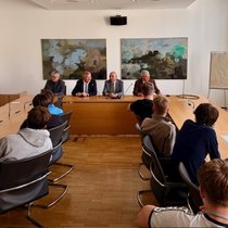 Im Anschluss daran erhalten die Schülerinnen und Schüler des Goethe-Gymnasiums die Chance, mit den zwei Abgeordneten aus dem Wahlkreis Regensburg, Jürgen Eberwein (CSU) und Jürgen Mistol (Bündnis 90/ Die Grünen) sowie MdL Martin Scharf (Freie Wähler) und MdL Horst Arnold (SPD) ins Gespräch zu kommen. Dabei interessiert die Schüler beispielsweise wie lange man zum Vorbereiten einer Rede im Plenum benötigt. Jürgen Mistol verrät, dass er schon während seiner Schulzeit am AAG in Regensburg für Referate „Spickzettel“ benötigte und auf diese auch im Plenarsaal zurückgreift, da er kein Freund der freien Rede ist. Jürgen Eberwein hat erst am heutigen Morgen erfahren, dass er am Abend um 22.00 Uhr mit einem Redebeitrag gefordert sein wird, deshalb muss er Spontanität zeigen und sich im Laufe des Nachmittags noch damit befassen. Horst Arnold betont in diesem Zusammenhang, dass der Redeentwurf nicht mit der jeweiligen Fraktion abgestimmt werden muss, da jeder Abgeordnete ein „Freies Mandat“ hat und nur seinem Gewissen unterworfen ist. Die Fraktion gehe aber natürlich davon aus, dass die Rede den Grundsätzen der Fraktion entspricht und nicht groß davon abweicht. Was alle vier Politiker eint, ist ihr politischer Werdegang, der stets auf kommunaler Ebene mit ehrenamtlichem Engagement und Mitglied im Stadt- oder Gemeinderat sowie Kreisrat begann ehe die Wahl zum Landtagsabgeordneten erfolgte.