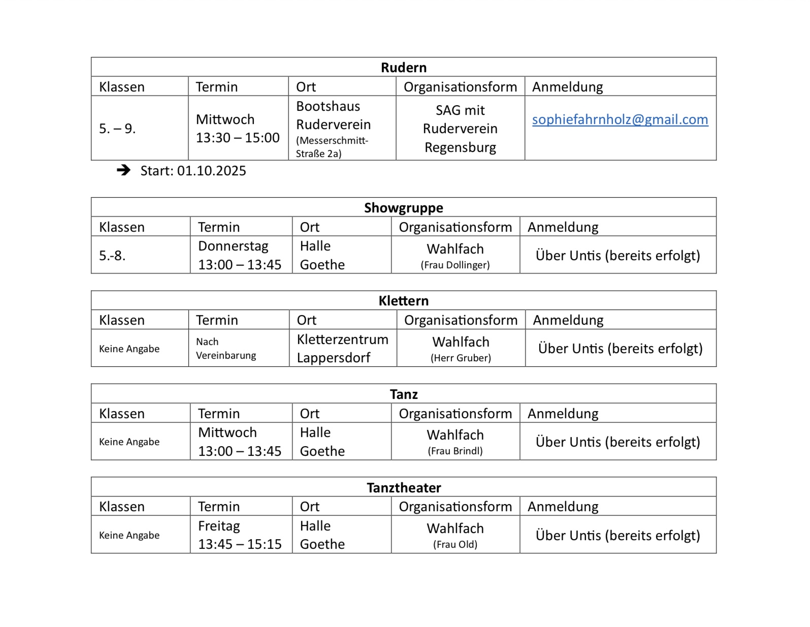Ganz neu ist die SAG Handball, die freitags ab 13:00 Uhr in Kooperation mit PostSüd-Regensburg für alle Jahrgangsstufen in der Goethe-Halle stattfindet. Bei Interesse schreiben Sie doch einfach eine Mail an c.blass-handball@web.de